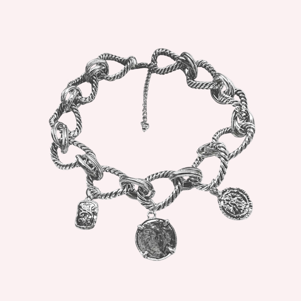 Silver Tone Chunky Chain Necklace With Vintage Coin Charms