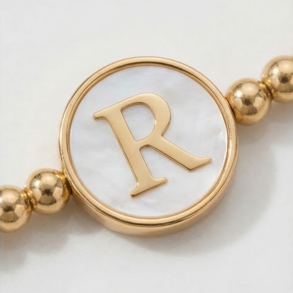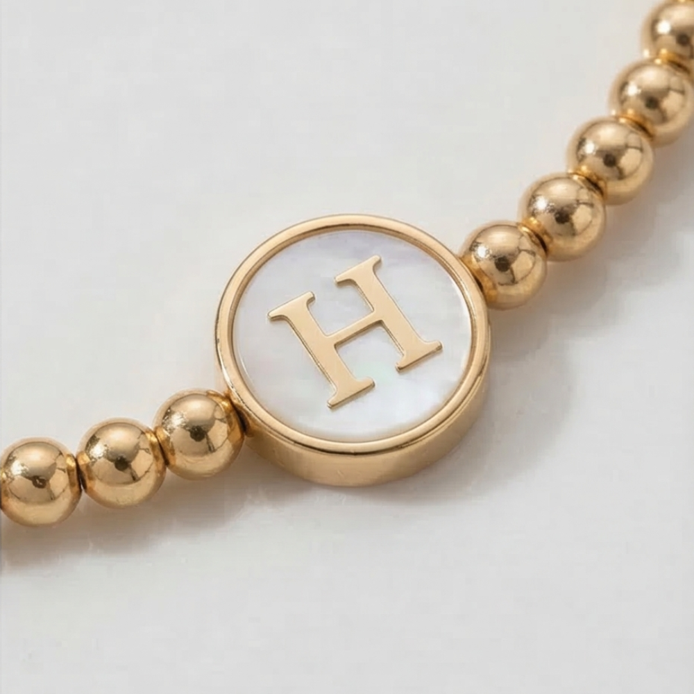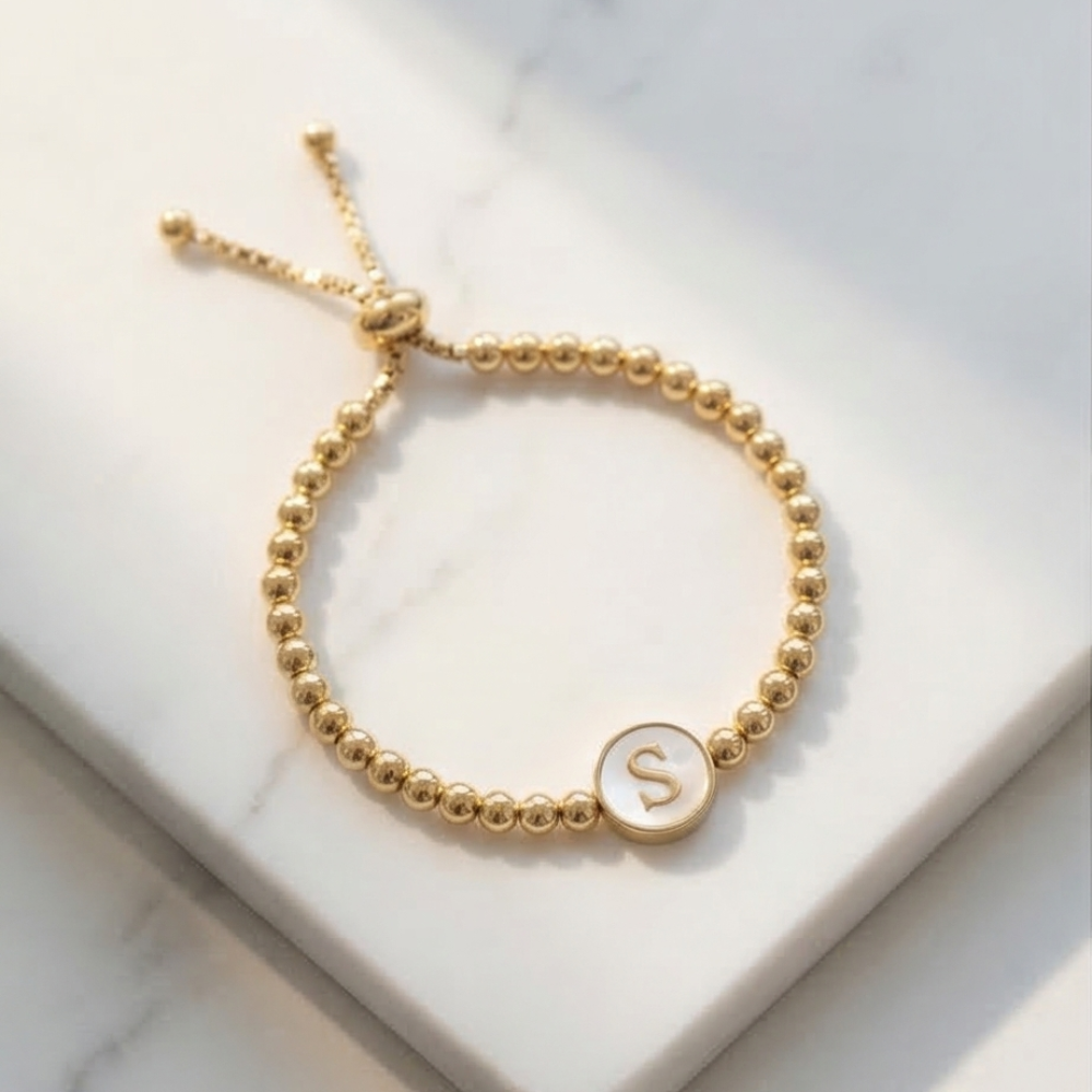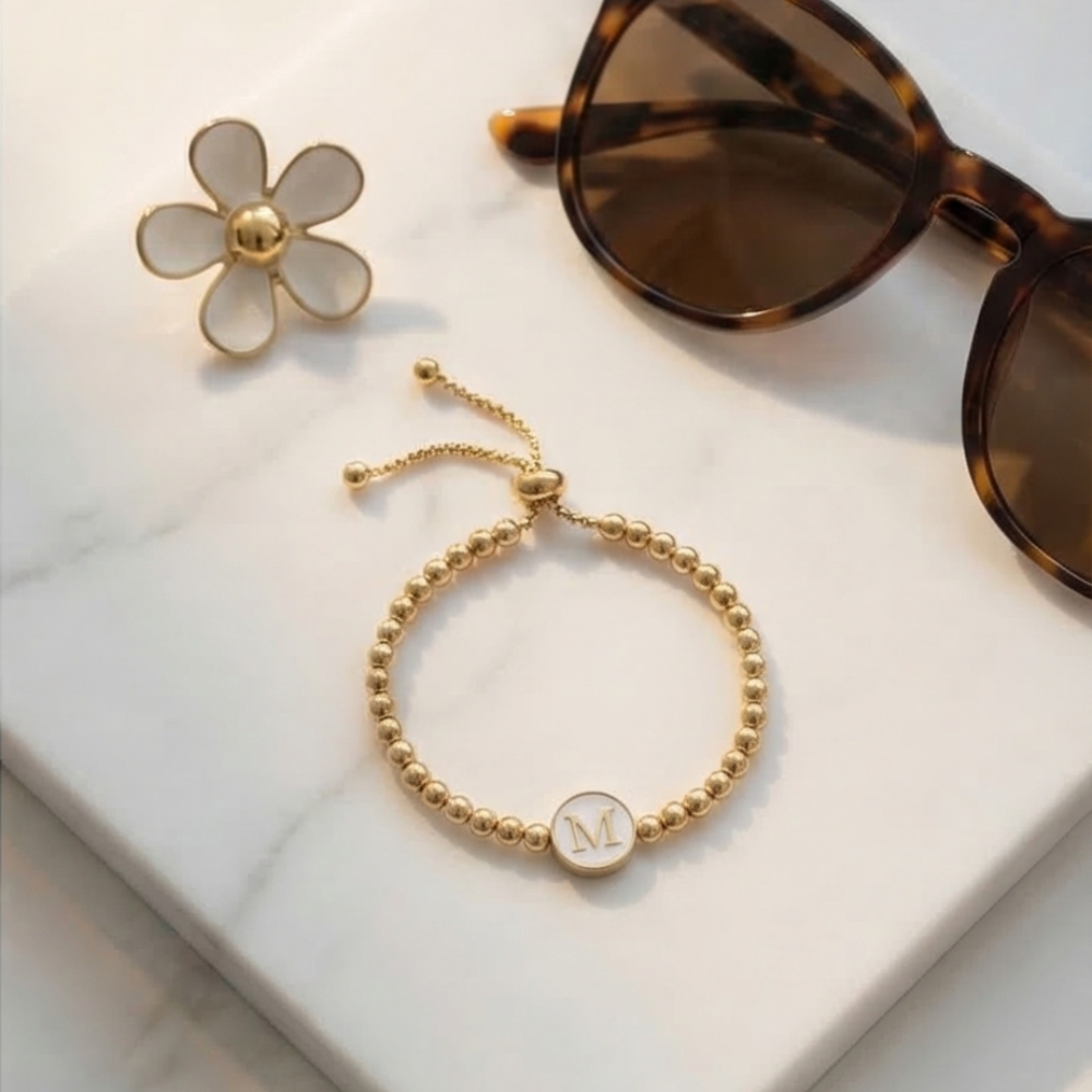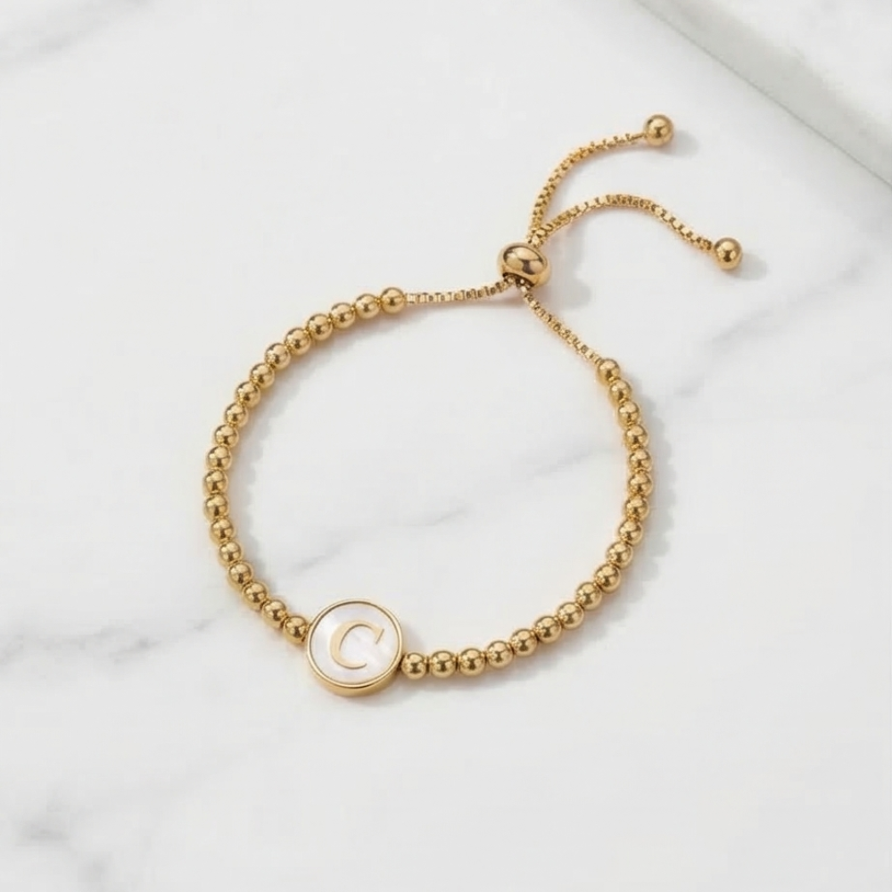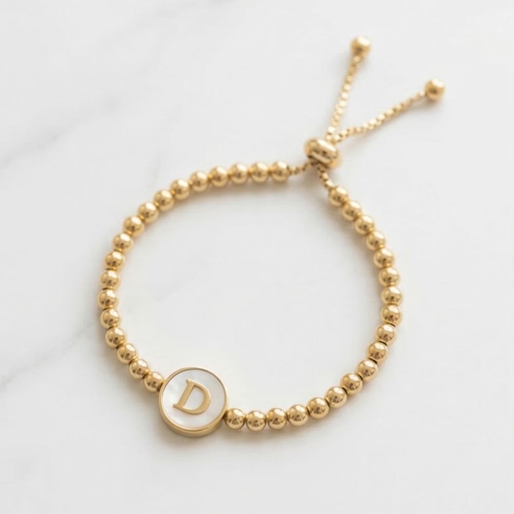 Adjustable Mother of Pearl Initial Bracelet – Personalized Gold Letter Bracelet