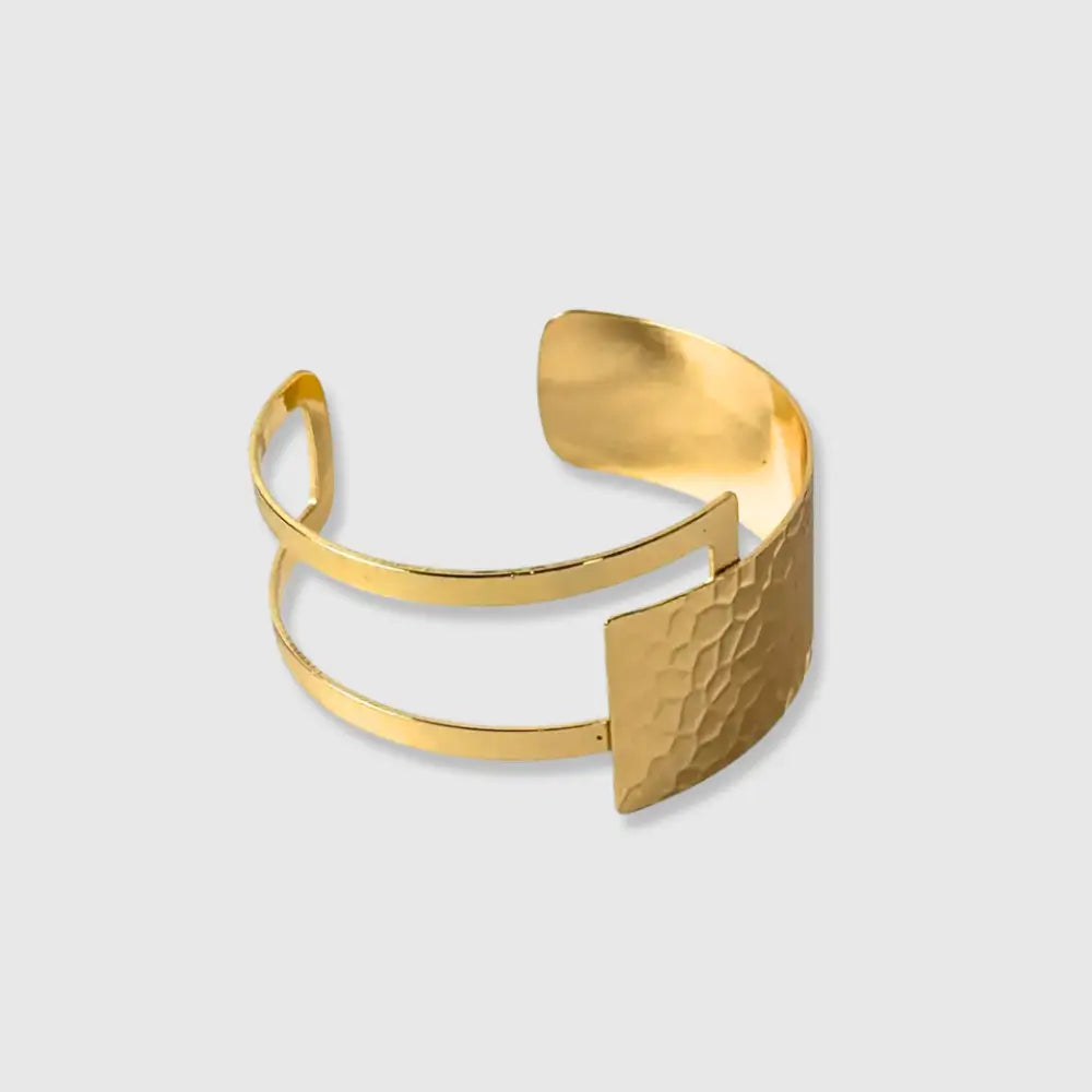 Regular price $24.00Sale price $24.00 Regular priceUnit price / perElevate your look with this gold-tone stainless steel hammered open cuff. Combining modern architecture and artisanal texture, this bold bracelet features a double-band design and a...