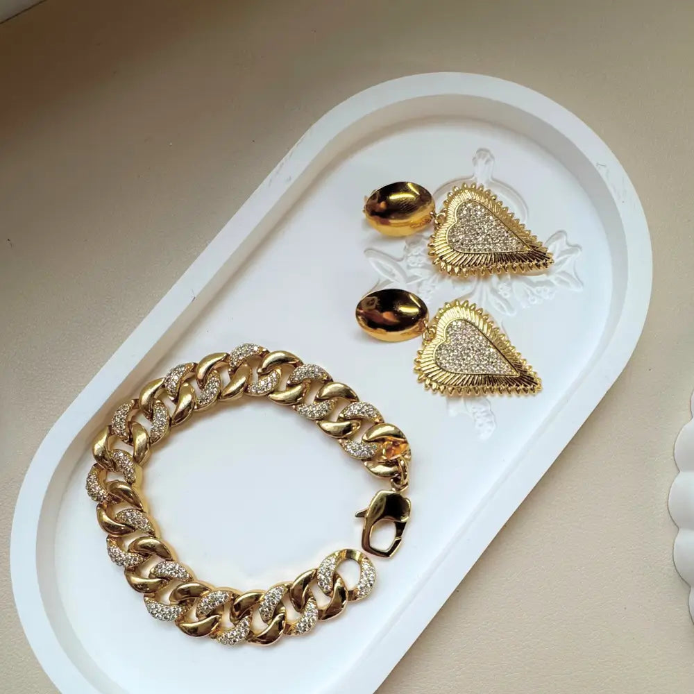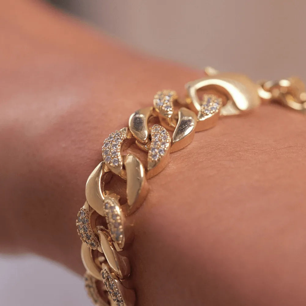 Make a bold and elegant statement with this 18K gold-plated Cuban link bracelet, hand-set with sparkling zirconia stones. The iconic curb chain design is elevated with high-polish gold plating and alternating pavé links, creating a luxurious, eye-catching finish. Perfect for empowered women who love sophisticated jewelry with a touch of glamour.
