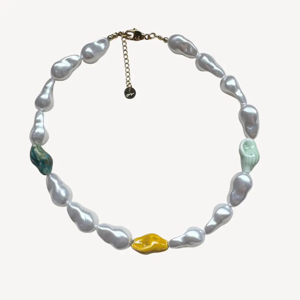 Add a playful and elegant touch to your look with our Cotton Pearl & Ceramic Bead Choker Necklace. Handcrafted with lightweight cotton pearls, known for their soft matte finish and volume, this necklace is accented with vibrant, hand-glazed ceramic beads, creating a modern, art-inspired statement piece.