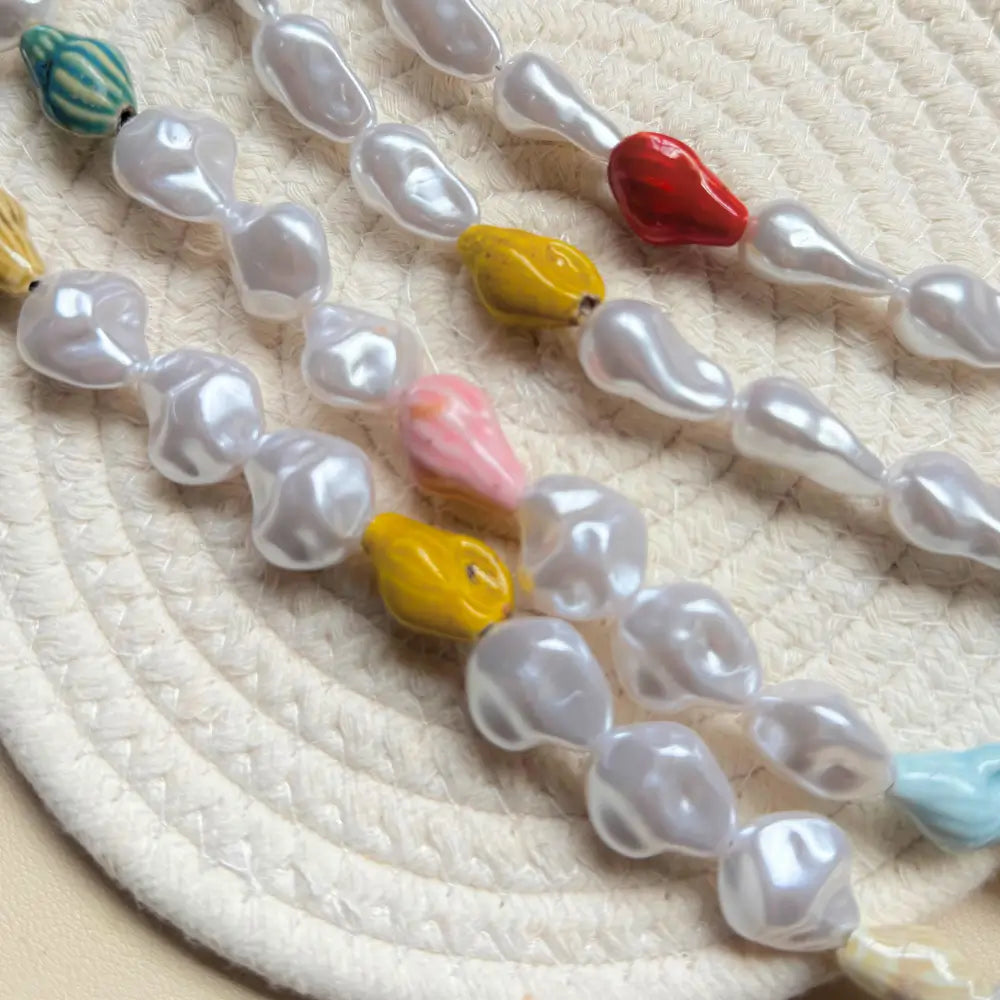 Material: 18K gold-plated brass, Cotton pearls (lightweight and slightly irregular) Hand-glazed ceramic beads in assorted colors 18K gold-plated stainless steel clasp and extension chain .