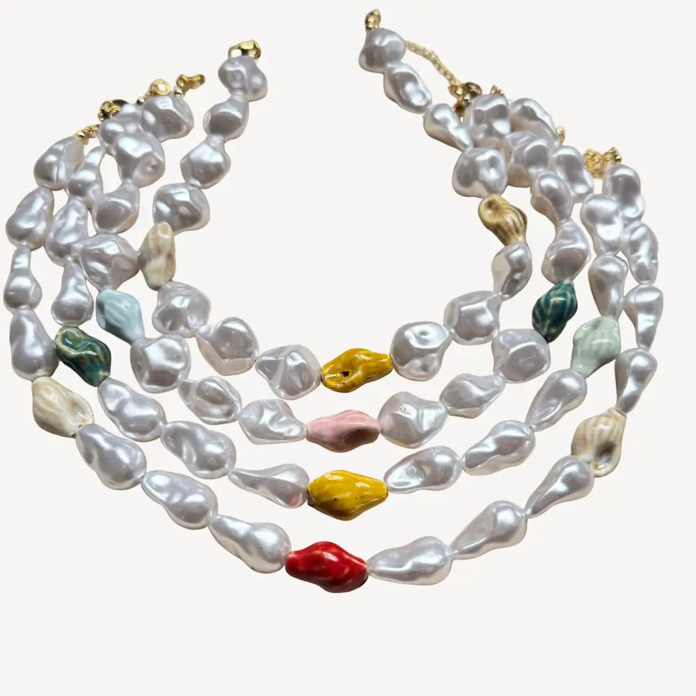 Handmade choker with irregular baroque pearls and colorful ceramic accents for a modern, artistic look.